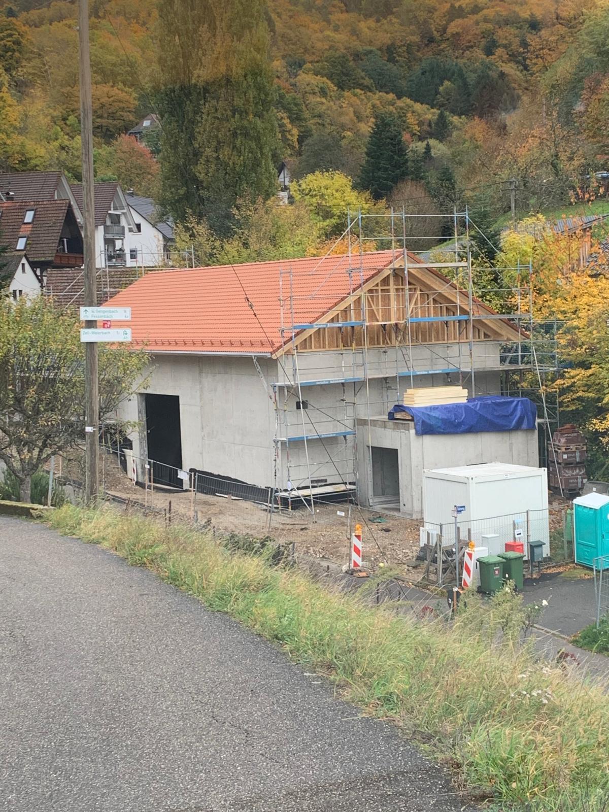 Das Dach wurde mit Ziegeln eingedeckt und auf der Südseite eine PV-Anlage installiert. Derzeit finden die Innenmontagearbeiten statt. Für den Straßenverkehr verbleibt die halbseitige Straßensperrung nach Regelplan Bl/2 mit einer Restfahrbahnbreite von mind. 3,50 m.