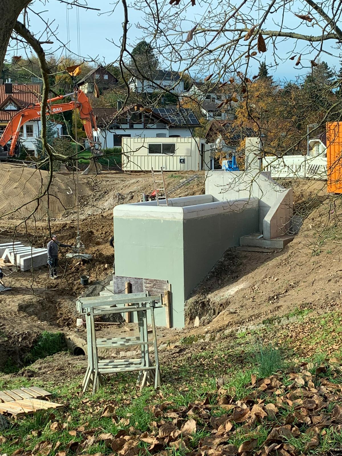 Die Firma Vogel-Bau hat am 25. August 2025 mit den Arbeiten begonnen. Diese sind bis Ende diesen Jahres geplant. Da die Arbeiten stark witterungsabhängig sind, kann sich die Bauzeit eventuell verlängern. Aufgrund der Arbeiten muss der Glascontainerstellpatz im Vorfeld des Hochwasserrückhaltebeckens über die Bauzeit verändert werden. Der neue Standort befindet sich weiterhin in der Wilhelm-Hamm-Straße in Richtung der Ringstraße, ca. 50 m vom alten Standort entfernt. Ebenso der Kleidercontainer.